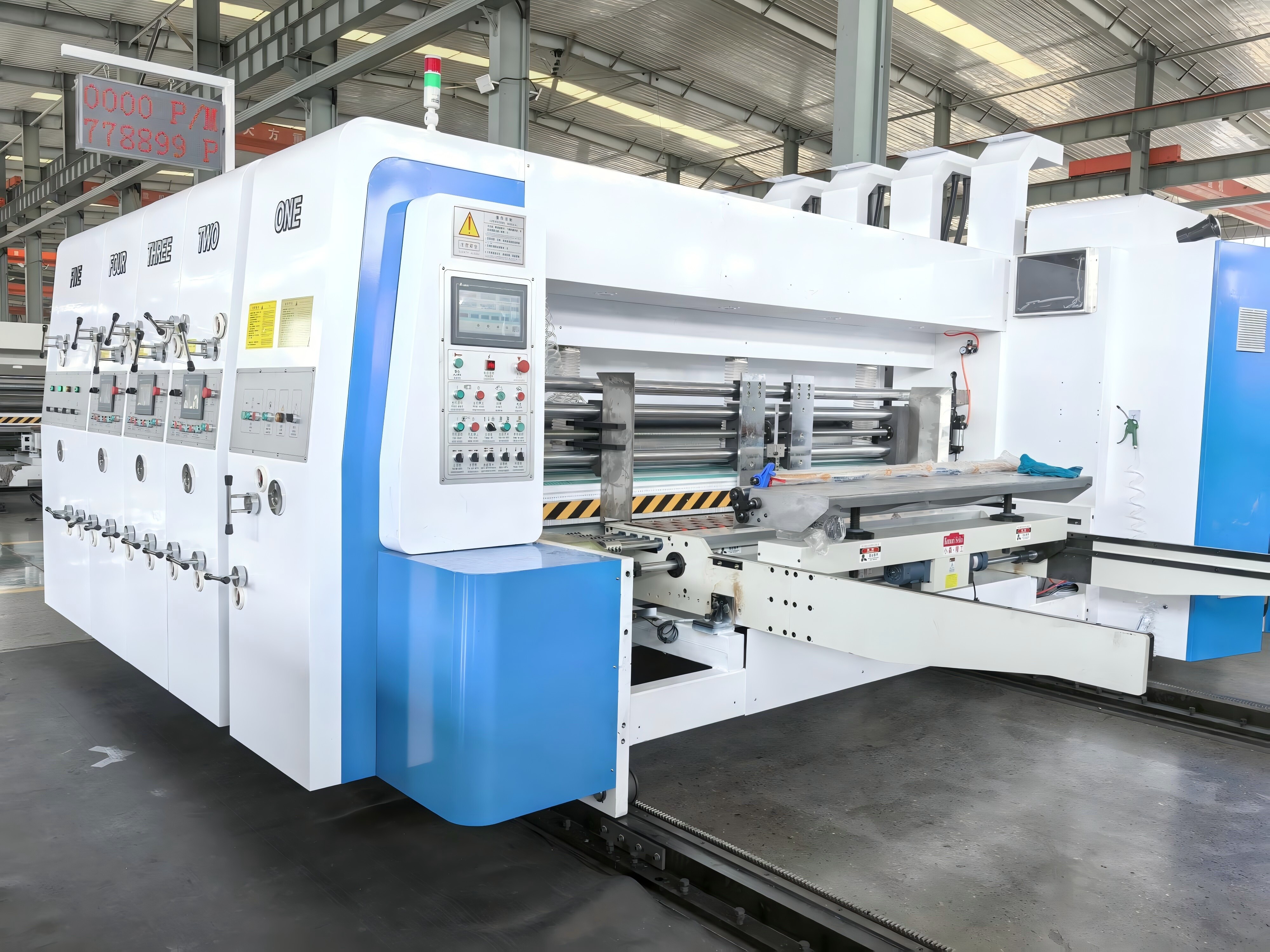 1.The machine consists of paper feeding, printing, and die-cutting sections, capable of completing processes such as printing, scoring, slitting, corner cutting, and hole punching for three-layer and five-layer corrugated cardboard in one pass.