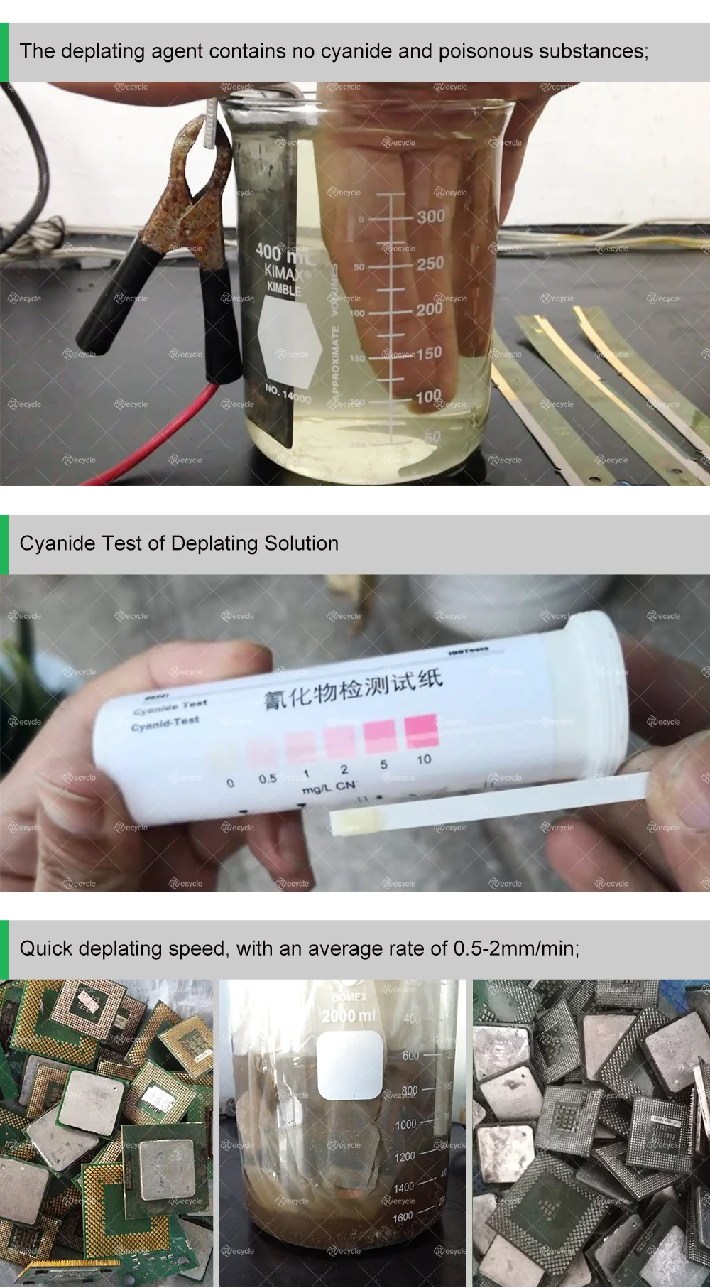 Our Gold Deplating System applies to various gold-plated scraps generated in our daily life, such as waste cellphone circuit boards, computer CPUs, motherboards, VCDs, DVDs, TVs, game consoles,fax machines, telephone sets and many other old domestic appliances, as well as those leftovers and off-cuts from the electroplating factory, electronic components manufacturing factory, printing house, photosensitive materials plant.