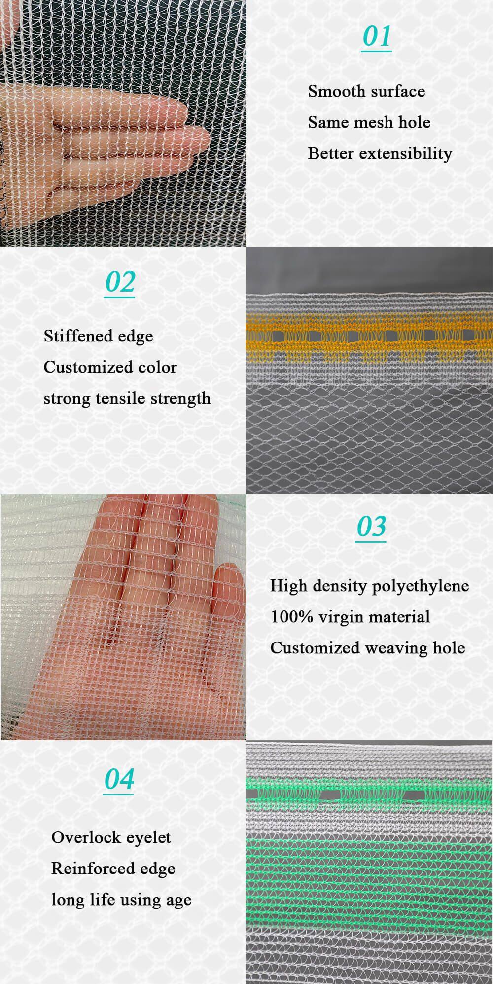Our main products contain Shade Net, Anti Hail Net, Construction Safety Net, Scaffolding net, Debris Netting, Olive Net, Privacy Net, Shade Cloth,Shade sail, Fishining Net and so on.
