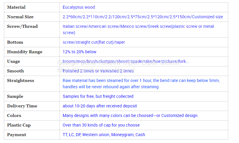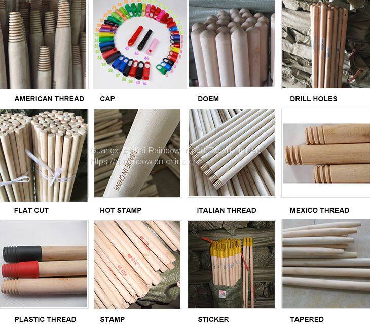 | PVC coated wooden broomstick | Natural wooden broomstick | Varnished broomstick | Natural shovel handle |