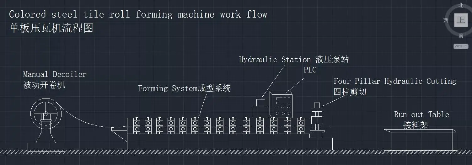 Manual uncoiler---feeding device---rolling form---speed, length, pieces set by PLC---hydraulic mold post cutting---collection table