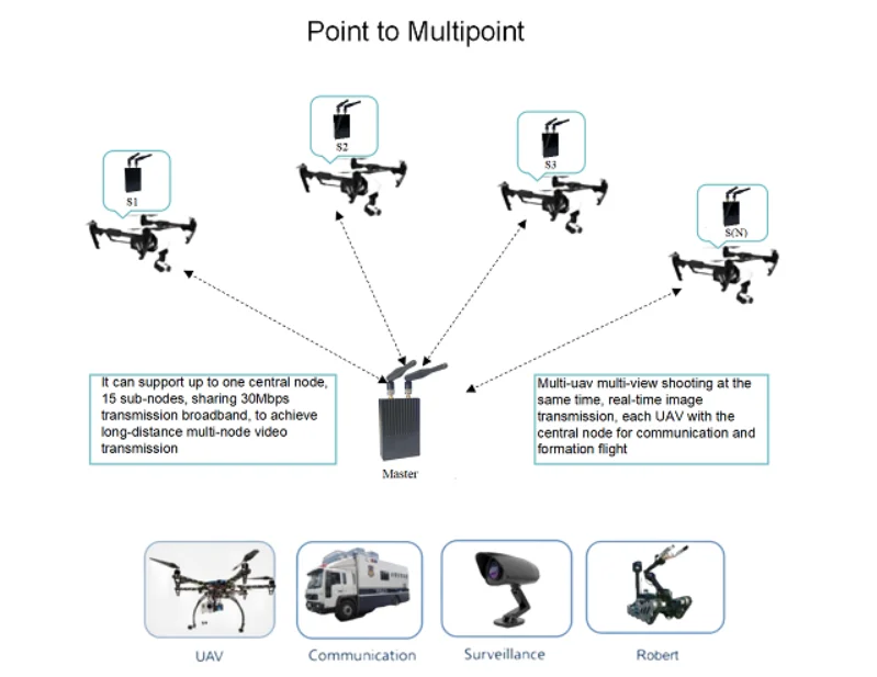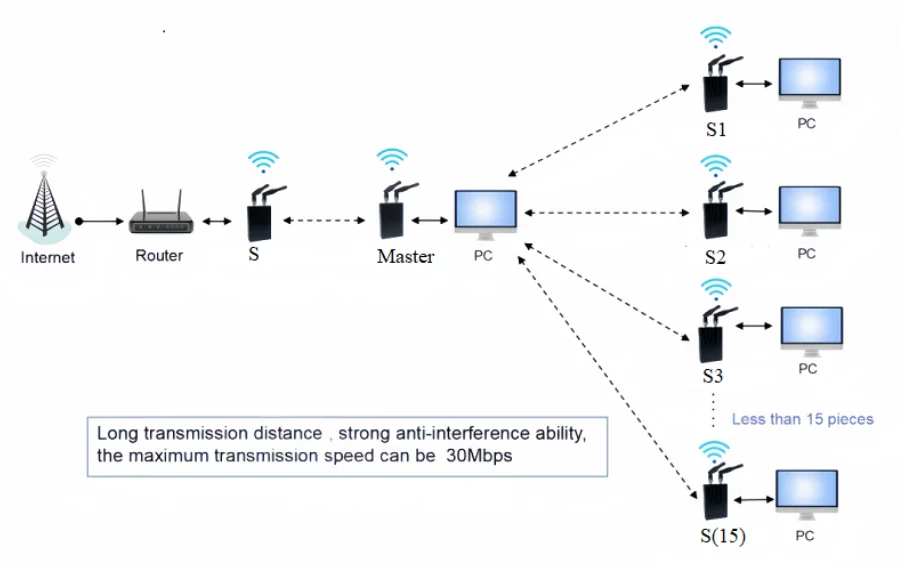 The product can do non-line-of-sight (NLOS) wireless high-speed data transmission in real time, and support PTP(point-to-point) and PTMP(point-to-multipoint) networking. Its real-time transmission can be up to 30Mbps,wireless bandwidth and signal strength is self-adaptive.