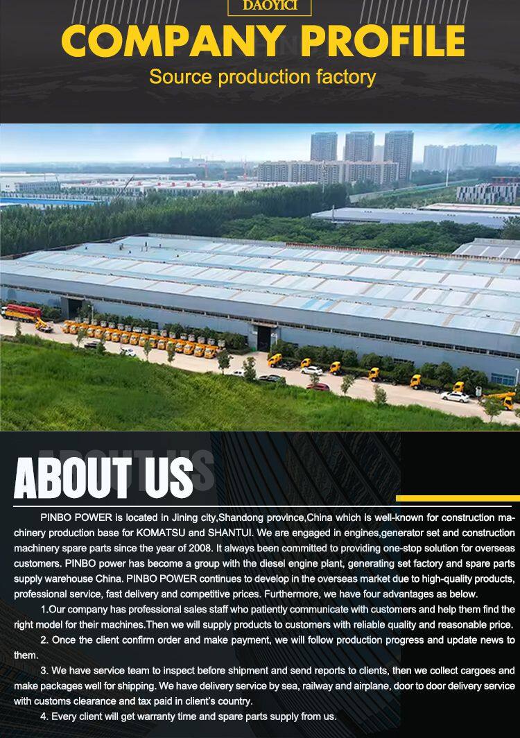 Jining Pinbo Import & Export Co., Ltd is located in Jining city,Shandong Province,which is well-known for production base for Shantui and Komatsu. Pinbo is manufacturer and trading company,it mainly deal in engine assembly,genset(generator set) and spare parts for construction machinery & heavy truck auto parts. The main products and brands are as below:Engine assembly and parts for Cummins,Doosan/Daewoo, Weichai, Deutz, Shangchai(SDEC),SINOTRUK,Volvo,Isuzu,Yuchai,YTO,FAW(XICHAI).Genset/generator set with Weichai, Deutz, Cummins, Yuchai,SDEC etc.brand.Construction machinery parts for Shantui,Komatsu,SEM,Hitachi,XCMG,SDLG,LONKING,LIUGONG,XGMA,ZF,SANY,ZOOMLION.Heavy truck and auto parts for SINOTRUK(HOWO),SHAANXI(SHACMAN),FAW,DONGFENG,ISUZU,VOLVO.Our company owns big warehouse and professional management team, so we can find the right parts quickly for customers with reasonable price, we can supply genuine and OEM parts as customer's request and have warranty time for them.So far,we have exported engines and spare parts to Russia,Uzbekistan,Mongolia,UK,Norway,Sweden,Italy,Nigeria,Tanzania,Mozambique,South Africa,Thailand,Indonesia,PNG,Brazil,Argentina,Peru etc.With the company philosophy of "Honesty, All-win, and sustainability", we sincerely welcome all customers visit our company to talk about business cooperation details.Your requirement is our working direction.