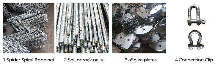Prestressed anchor. Different from tecco mesh system, which the anchor is wire rope anchors, the spider spiral protection system is equipped with reinforcing steel bar anchor, which has better hardness and stability. One side of the rebar anchor has threads and the diameter can be 25 mm or 28 mm.