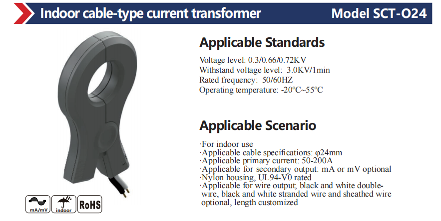 Jiangyin Spark XH-SCT-S24 Clamp on current senses AC current from 50 to 300 Amps passing through the center conductor.Clamp on CTs are Clamp and split core design ,can make installation with single hand .designed for fast and easy installation.The split core design permits non-contact current measurements through magnetic field induction without requiring that the primary wire be taken offline and disconnected for CT installation.This method permits a safer,easy and portable current measurement.