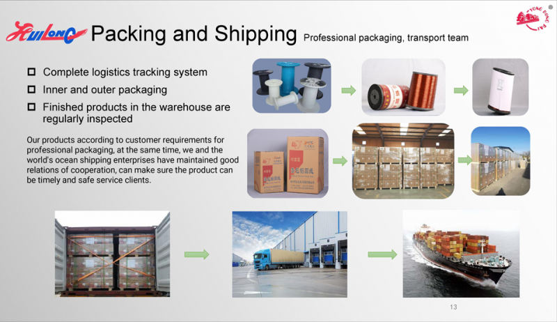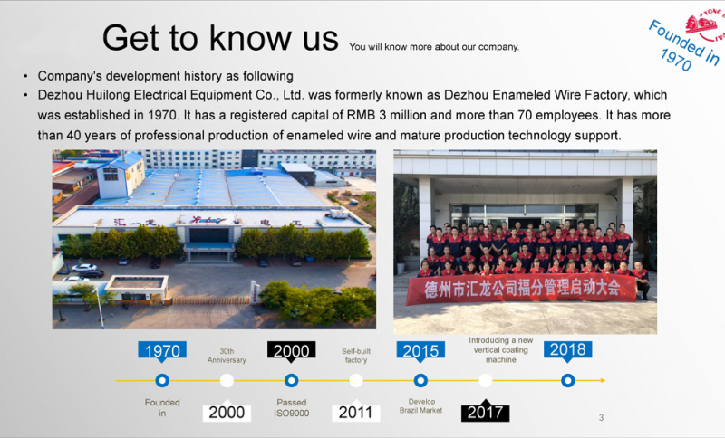 Shandong Huilong Electrical Material Co.,ltd. was founded in 1970. The factory is located in the north area of Tianqu Industrial Park, Dezhou City, Shandong Province. It has a registered capital of 3 million RMB. It covers an area of 23,310 square meters and it is a modern enterprise with a history of more than 50 years of professional enameled wire production. Welcome to visit our factory Shandong Huilong Electrical Material Co.,ltd. We renew our machinery park and our quality control laboratory with up-to-date technologies and increase our activity across international markets day by day. The company's products are widely used in Photovoltaic inverters,UPS inverters,power transformers, new energy electric vehicles, aerospace, Speaker coil,welding machines,instrumentation,household appliances,refrigeration compressors,deflection coils, high-frequency transformers,motors,electronics, power tools and other fields. The company's products are all based on IEC-60317, GB/T, JIS and NEMA production standards. With the in-depth development of global economic integration, in order to cope with the new opportunities and challenges brought by the international market, the company adheres to the business philosophy of “survive by quality and develop by credit”. The annual production capacity is up to 12,000 tons under full load. Shandong Huilong Electrical Material Co.,ltd. Our products have been exported to more than 50 countries in Europe, North America,South America,Africa, the Middle East and other regions. We offer customer specific solutions, tailor-made to suit every possible need. Whether standard or special, all our products are sustainably manufactured in a high-precision process using state-of-the-art technology. Please check out our product guide for more information!
