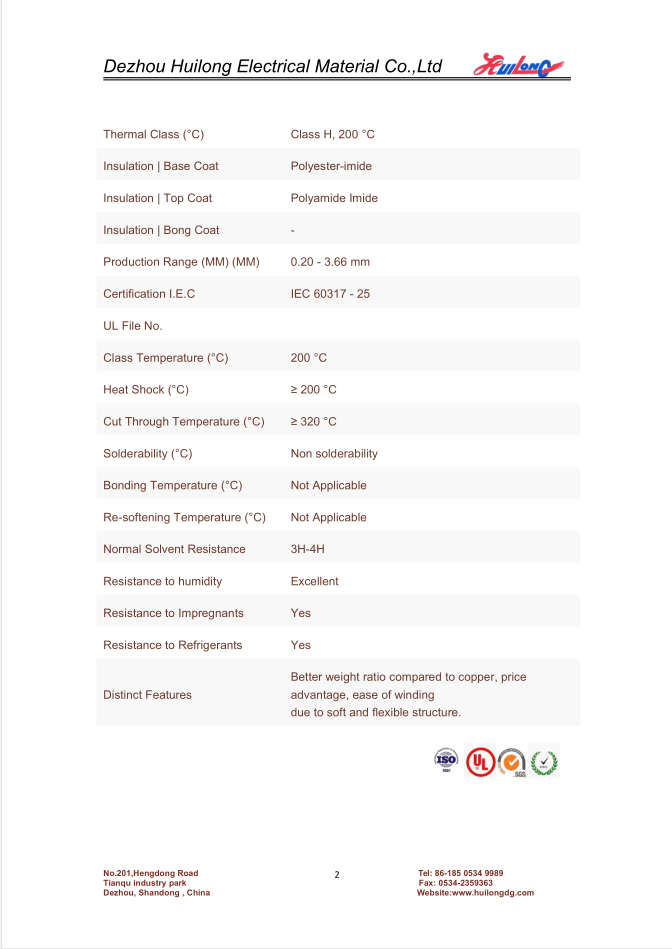 Shandong Huilong Electrical Material Co.,ltd. was founded in 1970. The factory is located in the north area of Tianqu Industrial Park, Dezhou City, Shandong Province. It has a registered capital of 3 million RMB. It covers an area of 23,310 square meters and it is a modern enterprise with a history of more than 50 years of professional enameled wire production. Welcome to visit our factory Shandong Huilong Electrical Material Co.,ltd. We renew our machinery park and our quality control laboratory with up-to-date technologies and increase our activity across international markets day by day. The company's products are widely used in Photovoltaic inverters,UPS inverters,power transformers, new energy electric vehicles, aerospace, Speaker coil,welding machines,instrumentation,household appliances,refrigeration compressors,deflection coils, high-frequency transformers,motors,electronics, power tools and other fields. The company's products are all based on IEC-60317, GB/T, JIS and NEMA production standards. With the in-depth development of global economic integration, in order to cope with the new opportunities and challenges brought by the international market, the company adheres to the business philosophy of “survive by quality and develop by credit”. The annual production capacity is up to 12,000 tons under full load. Shandong Huilong Electrical Material Co.,ltd. Our products have been exported to more than 50 countries in Europe, North America,South America,Africa, the Middle East and other regions. We offer customer specific solutions, tailor-made to suit every possible need. Whether standard or special, all our products are sustainably manufactured in a high-precision process using state-of-the-art technology. Please check out our product guide for more information!