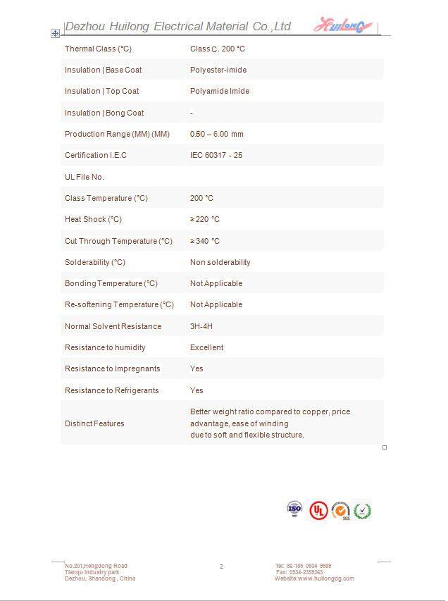 Shandong Huilong Electrical Material Co.,ltd. was founded in 1970. The factory is located in the north area of Tianqu Industrial Park, Dezhou City, Shandong Province. It has a registered capital of 3 million RMB. It covers an area of 23,310 square meters and it is a modern enterprise with a history of more than 50 years of professional enameled wire production. Welcome to visit our factory Shandong Huilong Electrical Material Co.,ltd. We renew our machinery park and our quality control laboratory with up-to-date technologies and increase our activity across international markets day by day. The company's products are widely used in Photovoltaic inverters,UPS inverters,power transformers, new energy electric vehicles, aerospace, Speaker coil,welding machines,instrumentation,household appliances,refrigeration compressors,deflection coils, high-frequency transformers,motors,electronics, power tools and other fields. The company's products are all based on IEC-60317, GB/T, JIS and NEMA production standards. With the in-depth development of global economic integration, in order to cope with the new opportunities and challenges brought by the international market, the company adheres to the business philosophy of “survive by quality and develop by credit”. The annual production capacity is up to 12,000 tons under full load. Shandong Huilong Electrical Material Co.,ltd. Our products have been exported to more than 50 countries in Europe, North America,South America,Africa, the Middle East and other regions. We offer customer specific solutions, tailor-made to suit every possible need. Whether standard or special, all our products are sustainably manufactured in a high-precision process using state-of-the-art technology. Please check out our product guide for more information!