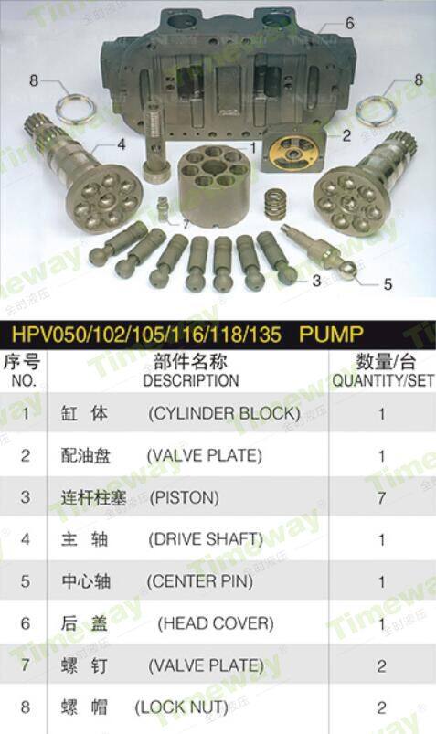 HPV050; HPV080; ZX120-6 main pump (HPK055); HPV091 (EX200-2/3, EX120-2 single pump); HPV102 (EX200-5/6); HPV116 (EX200-1); HPV118 (ZX200-3, ZX270 main pump)etc. |