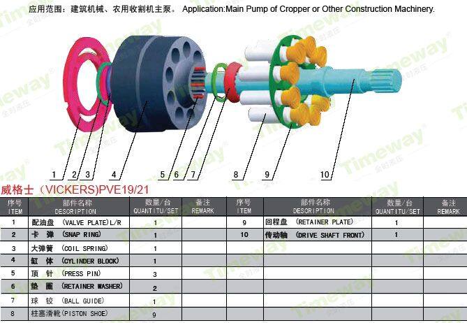 Vickers series: | PVE19;TA19;PVE21;PVH45;PVH57;PVH74;PVH81;PVH98;PVH106(HPN-1398);PVH131;PVH141;PVB5;PVB6;PVB10;PVB15(PVQ32 some common);PVB20;PVB29;PVBQA29-SR;PVQ40 /50; PVB110; TB35; B45. | ||||||