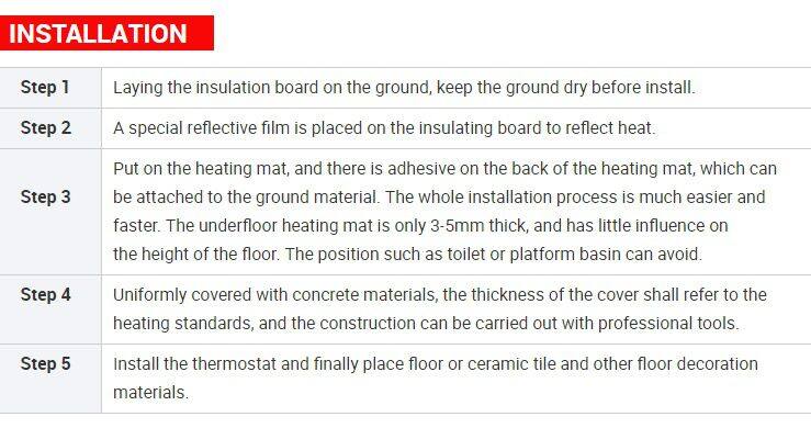 original ground. In addition, the thin,pre-heated layer gives you the desired floor temperature in 20-30 minutes after starting the system, so this fast heating system is the best choice for home. Heating mat used for overall heating, comfortable heating,wall heating, Indoor high-level demanding and the second decoration.