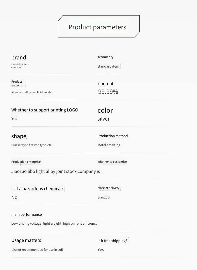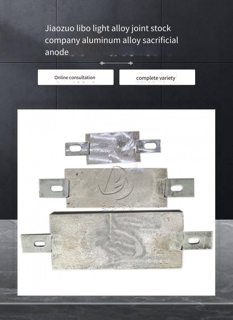 Custom processing of high-efficiency aluminum alloy sacrificial anodes, high-efficiency aluminum anodes, high-quality suppliers. The aluminum anodes produced by Jiaozuo Libo Light Alloy Co., Ltd. can prevent the corrosion of steel structures in seawater. They are widely used in the anti-corrosion of ship hulls, ballast tanks, seawater pipelines, port and dock facilities, ocean engineering, drilling platforms, condensers, etc. Since the performance of aluminum anodes is affected by the alloy composition, we offer different aluminum alloy combinations to meet customers' requirements. The standard implemented by our company is GB/T4948-2002. Different sizes can be customized according to customers' requirements!