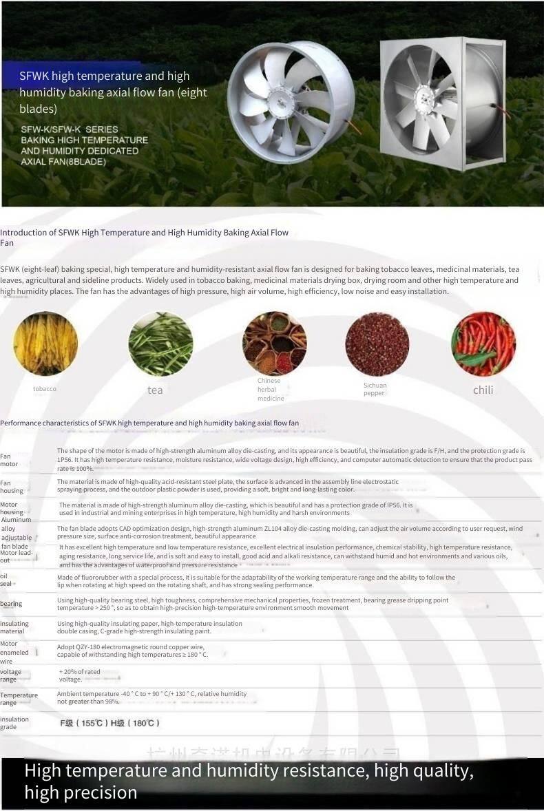 The SF high-temperature, high-humidity and low-noise axial flow fan for baking is a fan designed for tobacco leaf baking. The motor uses F-class and H-class insulation, featuring high temperature resistance, high humidity resistance, high efficiency, large air volume, low noise, energy saving and other characteristics. The fan blades are optimally designed by CAD, with four arc-shaped aluminum alloy die-cast aluminum blades.