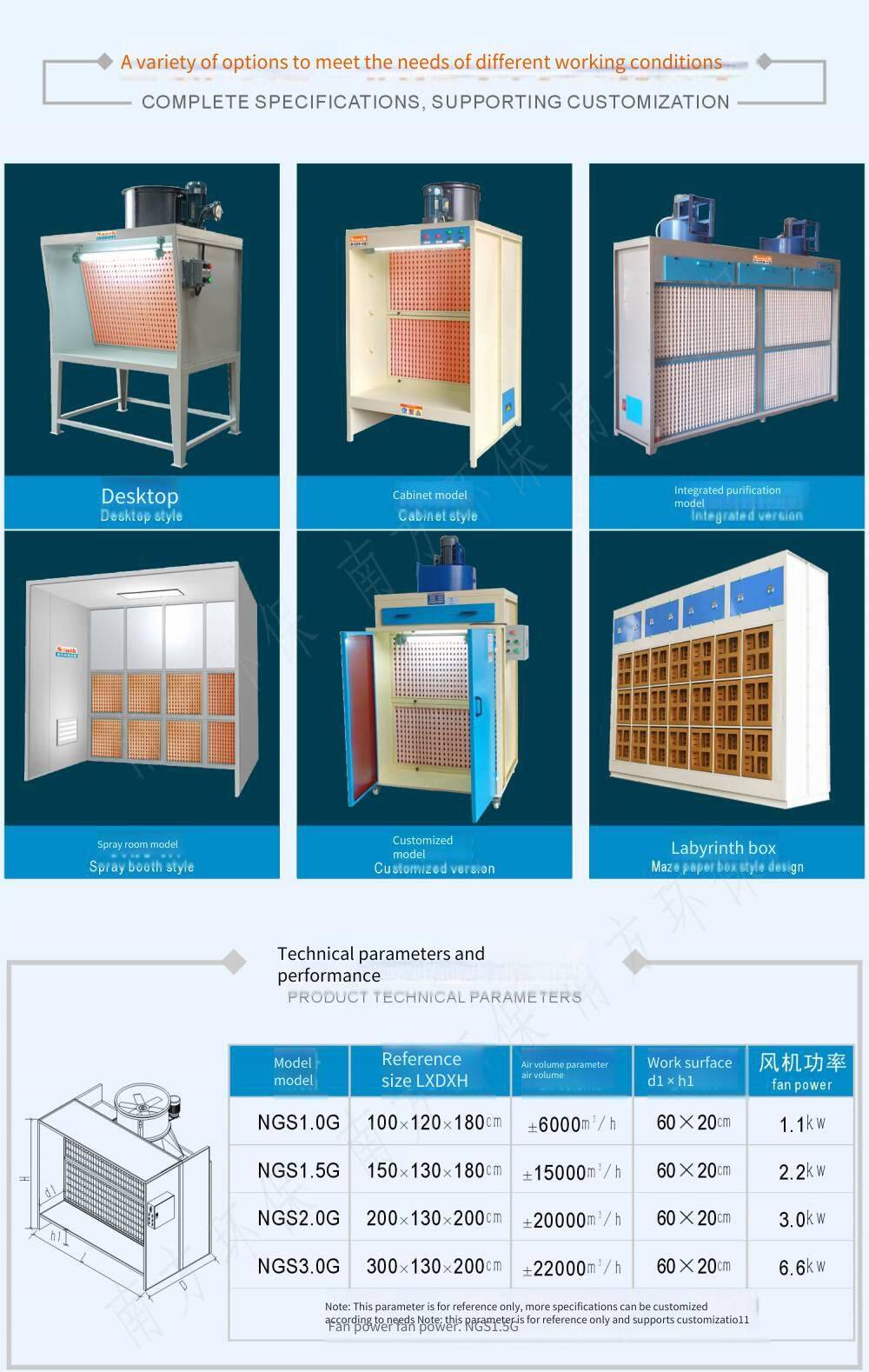 The NGS series of dry paint spray cabinets come in structures such as desktop, cabinet, and floor-standing types. They are made of pleated V-shaped filter paper or box-type punched, folded, and bonded materials. Due to the special distribution of the chambers, the airflow generates a Venturi or cyclone effect, causing paint particles to accumulate in numerous separation chambers with large capacities. Even for viscous paint materials, there are no phenomena such as surface scaling and blockage. Since this equipment has more advantages than traditional water curtain cabinets, it is increasingly favored by the painting industry.