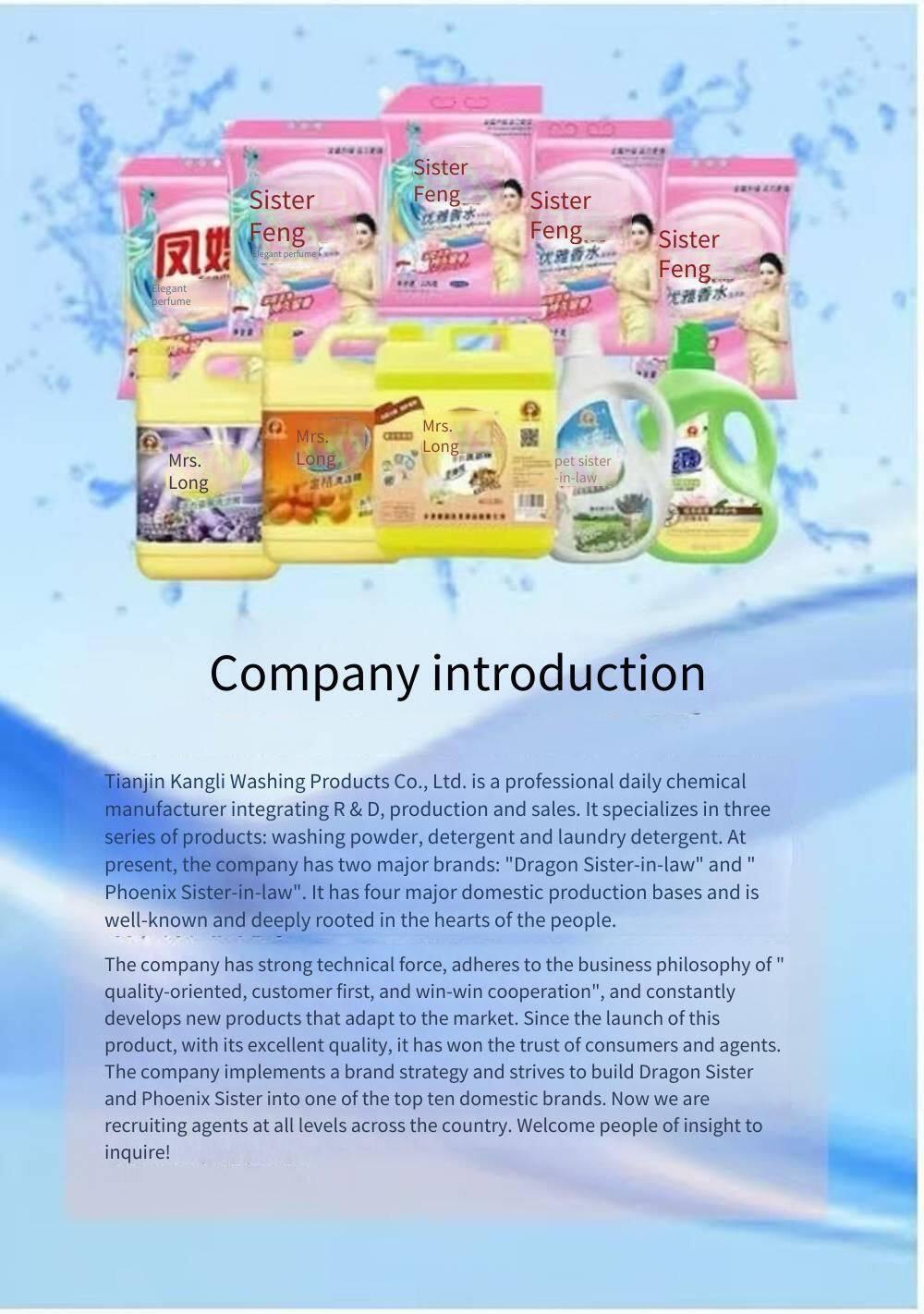 Tianjin Kangli Detergent Products Co., Ltd. is a professional detergent products company integrating science and technology, production and sales. The company's main products include washing powder, laundry detergent, dishwashing liquid, soap powder and other types of detergent products. It has established four major production bases in China, covering the domestic market. The slogan "Wash well, use Long Sao" is well - known and deeply rooted in people's hearts. New and old customers are welcome to visit the company for inspection. The company has strong technical strength, makes long - term commitments to domestic consumers and pursues sustainable development. It adheres to the business philosophy of "Quality first, Reputation is gold, Win - win cooperation", and continuously innovates and develops products recognized by consumers. Since the product was launched, with its excellent quality, it has brought a new washing concept and a new marketing and service system to consumers, and has been well - received by agents and consumers across the country. The company implements a brand strategy to create a Chinese national brand. In order to better develop new markets, the company sincerely hopes to cooperate with distributors across the country to jointly draw a grand blueprint for development. Tianjin Kangli is now sincerely recruiting agents at all levels nationwide. People of insight are welcome to call for consultation!
