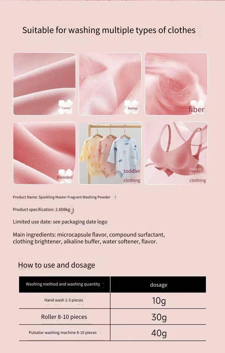 1. Long-lasting fragrance: Fengsao Perfume Laundry Detergent is known for its long-lasting fragrance. After washing, the clothes can maintain a fresh aroma for a long time. For example, Fengsao Perfume Laundry Detergent uses fragrance microcapsule technology to release fragrance when the clothes rub against each other, providing a long-lasting fragrance experience.