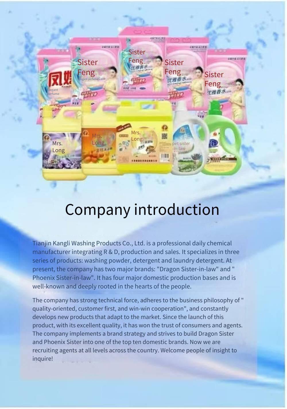 Tianjin Kangli Detergent Products Co., Ltd. is a professional detergent products company integrating technology, production and sales. The company's main products include washing powder, laundry detergent, dishwashing liquid, soap powder and other various detergent products. It has established four major production bases in China, covering the domestic market. The slogan "Wash well, use Long Sao" is well - known and deeply rooted in people's hearts. New and old customers are welcome to visit the company for inspection. The company has strong technical strength, makes long - term commitments to domestic consumers and pursues sustainable development. It adheres to the business philosophy of "Quality first, Reputation is gold, Win - win cooperation", continuously innovates and develops products recognized by consumers. Since the products were launched on the market, with excellent quality, they have brought new washing concepts and new marketing and service systems to consumers, and have been well - received by agents and consumers across the country. The company implements a brand strategy to build a Chinese national brand. In order to better develop new markets, the company sincerely hopes to cooperate with distributors across the country to jointly draw a grand blueprint for development. Tianjin Kangli is now sincerely recruiting agents at all levels nationwide. People of insight are welcome to call for consultation!
