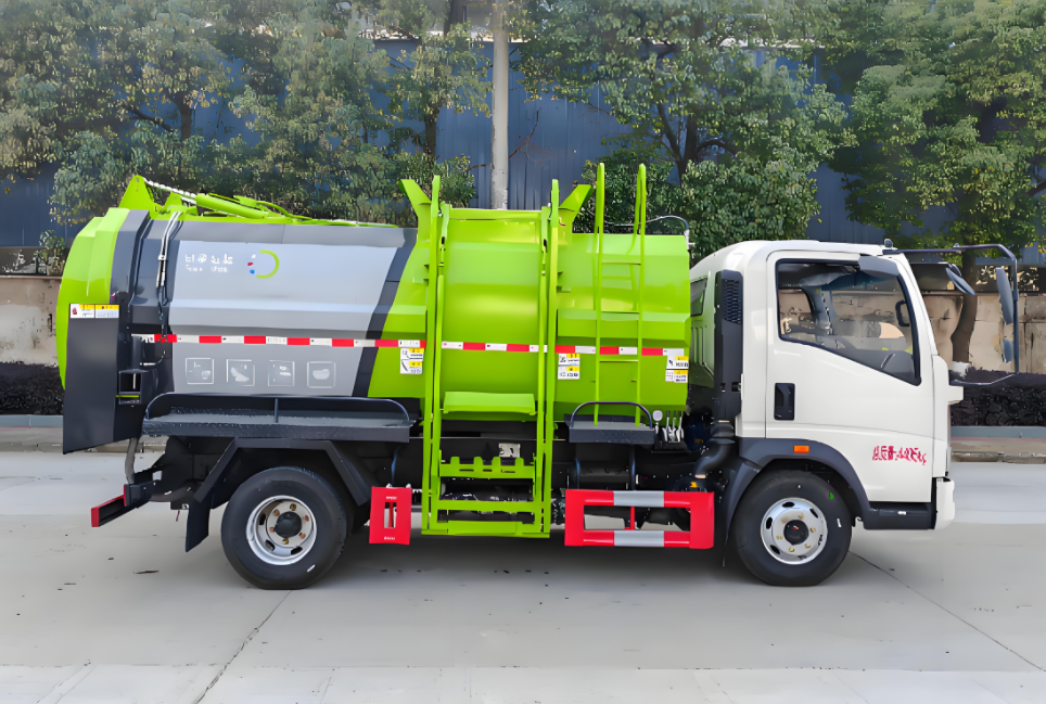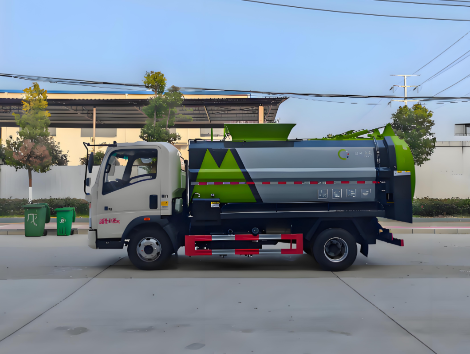 Optional pull-rod or chain-type lifter, capable of hanging 120L/240L standard plastic garbage bins. The rear cover is hydraulically opened and locked, with a sealing strip attached. It is paired with a bolt-adjustable hydraulic locking mechanism to ensure no water leakage. Central double-top lifting and discharging system, with the discharging angle adjustable according to requirements. Equipped with wireless remote control for more convenient operation.