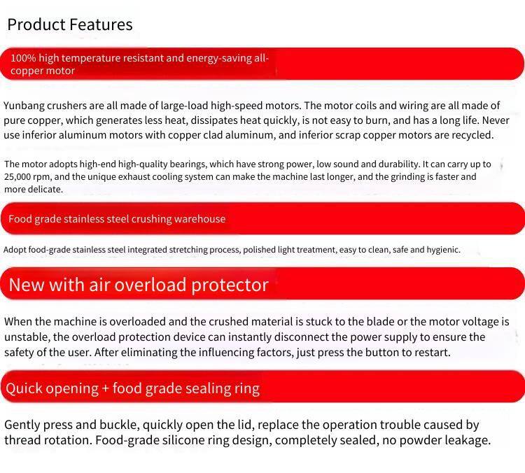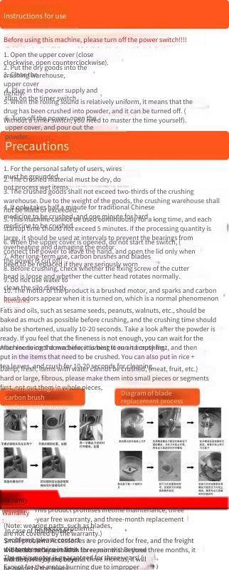 Warm reminder: The 150-gram machine is not suitable for grinding super-hard medicinal materials such as Sanqi, Ganoderma lucidum, and pearls. Please choose a machine of 250 grams or more and cut the materials into small pieces. Otherwise, it will shorten the lifespan of the machine!