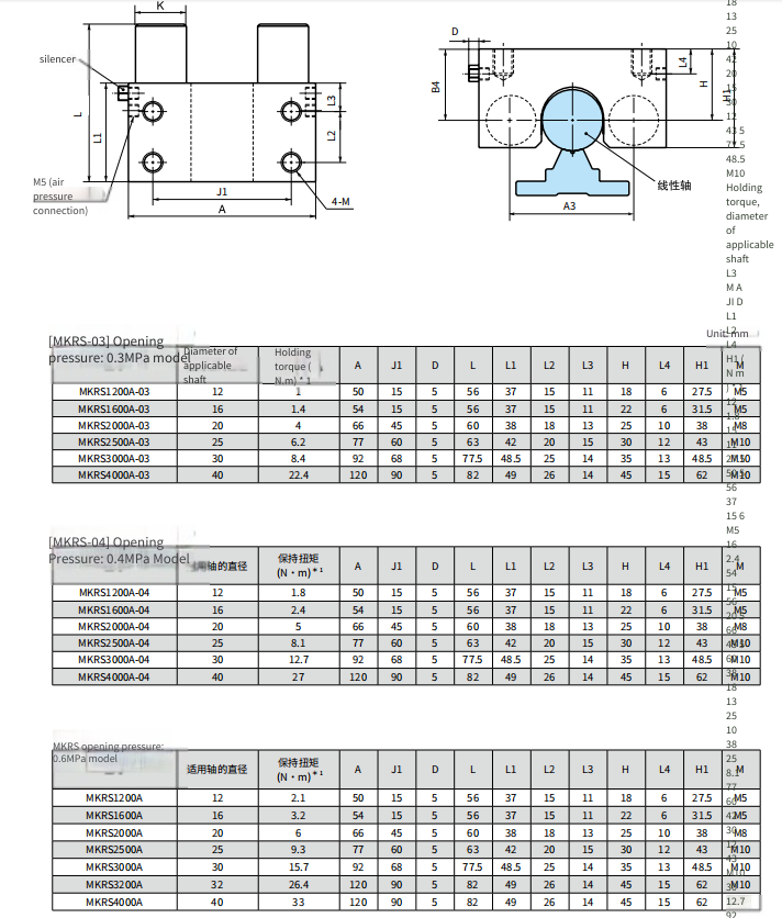 When air pressure is discharged: The shaft is clamped by the force of the spring.Products with opening pressures of 0.3MPa and 0.4MPa have been standardized.