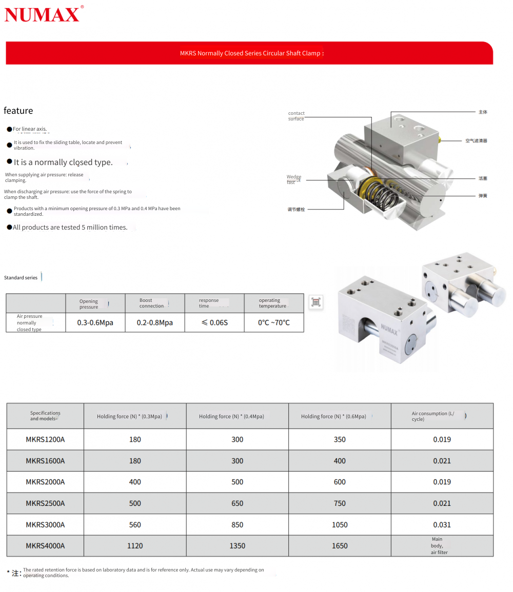Domestically produced in-stock linear rail grippers. NUMAX pneumatic normally open type optical axis brake MKR5000A, a locking device for spools. Product parameters: