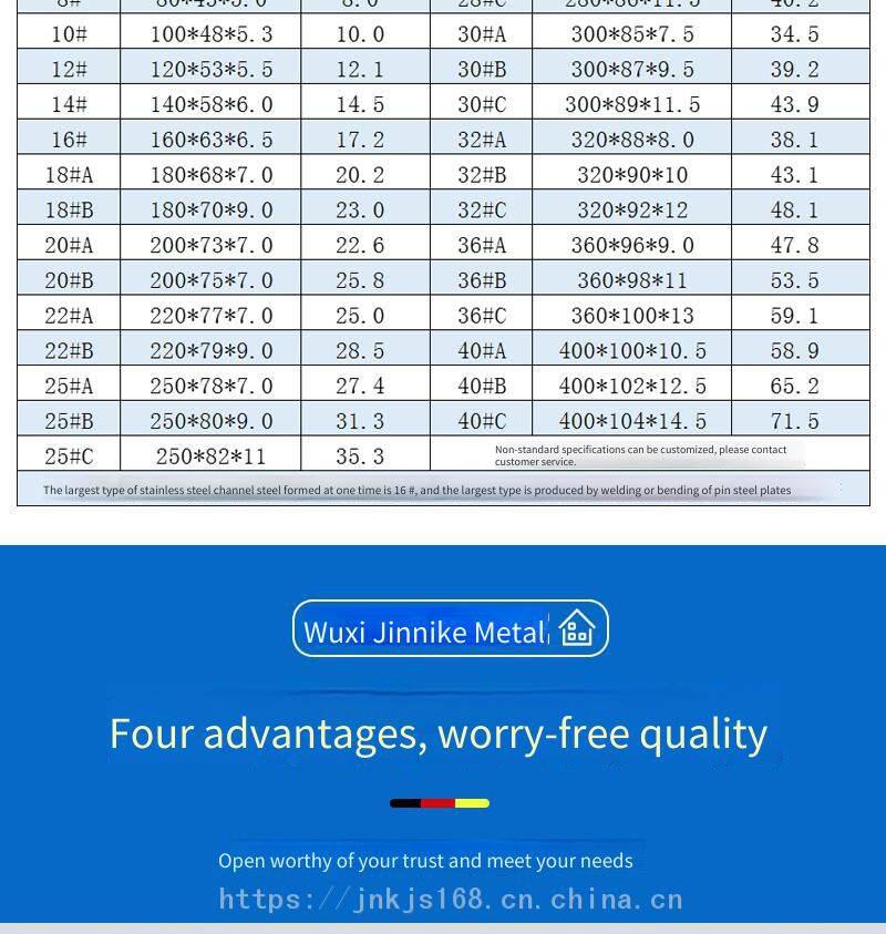 Wuxi Jinnike Metal Products Co., Ltd. is a comprehensive enterprise specializing in the production, processing, fabrication and installation of stainless steel products. It has a group of experienced professional technical talents with modern high - level skills and advanced mechanical equipment. The company's business philosophy is committed to creating high - quality products and a good corporate image. Our company mainly produces: stainless steel plates, stainless steel pipes, stainless steel profiles (angle steel, channel steel, flat steel, hexagonal bars, square steel), stainless steel bars. We have a complete range of specifications and can customize non - standard products. The minimum order quantity is 500 kg, with a complete range of materials such as 201, 304, 316L, 310S, 2205, 2507, 904L. We offer door - to - door delivery across the country. We accept acceptance settlement and provide loading and delivery services for customers during holidays. The company's concurrent business items: processing services: plate shearing, bending, groove planing, punching, rounding, water jet cutting, welding, special - shaped processing, stainless steel flagpoles, etc.