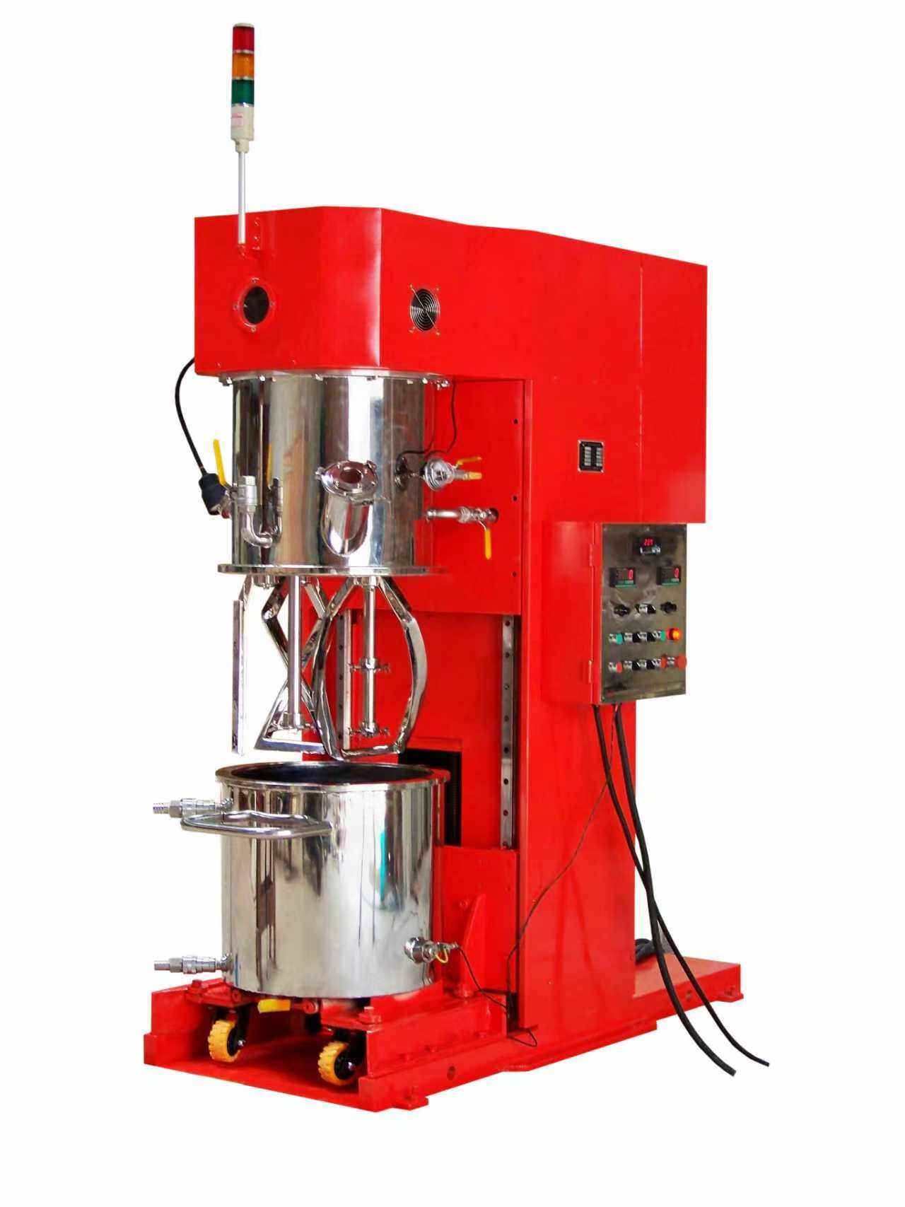 The planetary power mixer is a dynamic mixing and dispersing device with no dead spots. Featuring a unique stirring mechanism, the discharge barrel remains stationary while the dispersing disc and stirring paddle perform both orbital and rotational planetary motion at adjustable speeds. This complex motion subjects materials to intense shearing and kneading, ensuring thorough dispersion and mixing without dead spots. An automatic wall-scraping mechanism is integrated within the vessel to dislodge adhered materials for continued mixing. Featuring a unique sealing design, the mixer supports pressurization or vacuum degassing. It finds extensive application across chemical, light industry, food, pharmaceutical, construction materials, and pesticide sectors for solid-solid, solid-liquid, and liquid-liquid mixing, reaction, dispersion, dissolution, homogenization, and emulsification processes. Power mixers are ideal equipment for producing inks, pigments, adhesives, sealants, ointments, paste-like materials, greases, paints, cream cosmetics, emulsions, paste foods, and additives.