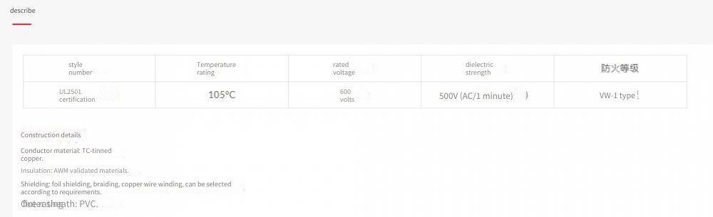 UL2517/2501 is a PVC sheathed cable with a temperature rating of 105 degrees Celsius and a VW-1 flame retardant rating. It uses pure copper stranded wire as the conductor to ensure excellent electrical performance.