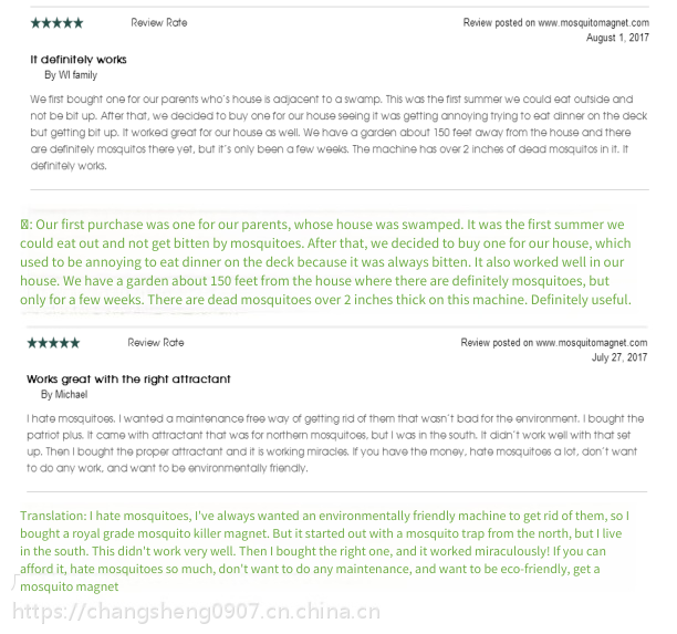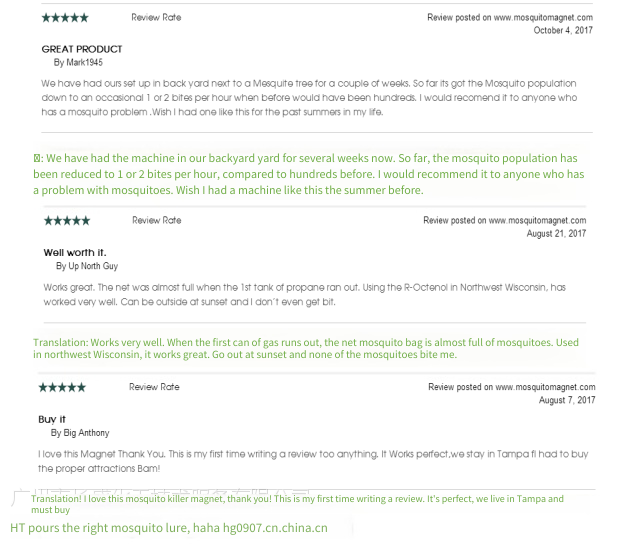 Answer: Using it continuously for 1 month can significantly reduce the number of mosquitoes. Using it for 2 to 3 months can interrupt the mosquito breeding cycle, making the living environment free from mosquito bites. (Note: "Free from mosquito bites" does not mean completely mosquito - free. Because the Mosquito Magnet specifically kills female mosquitoes that bite and suck blood, and does not catch male mosquitoes that live on flower juice, dew, etc.)
