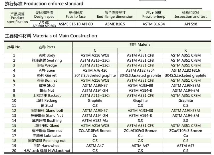 ANSI API6d 150# 300# 600# Wcb Gate Valve main material of parts | ||