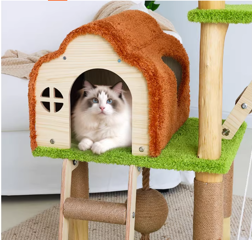 Natural Wooden Cat Tree With Cozy Cat Condo and Hanging Swing for Kittens and Adult CatsNegotiableMOQ: 10 Sets