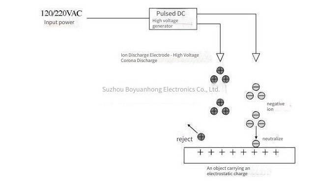 The pulsed DC high - voltage generator raises the 120 or 220VAC input voltage and outputs positive and negative voltages in a turbulent flow with a cycle of 0.2 - 1 second to act on the discharge electrode, ionizing the air to alternately generate positive and negative ions. When an object carries a positive static charge, negative ions will neutralize it; conversely, if an object carries a negative static charge, positive ions will neutralize it.