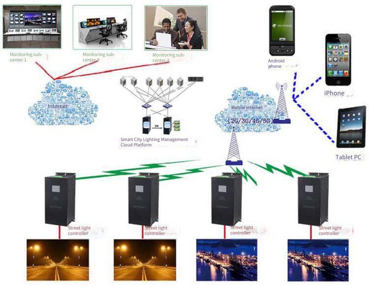 The intelligent street lamp control system is a distributed control system structure composed of a central control room and power-saving monitoring stations distributed in street lamp control boxes in the urban area. Through wireless means, it conducts remote control, remote measurement, and remote communication for dozens or even hundreds of control points distributed outdoors.