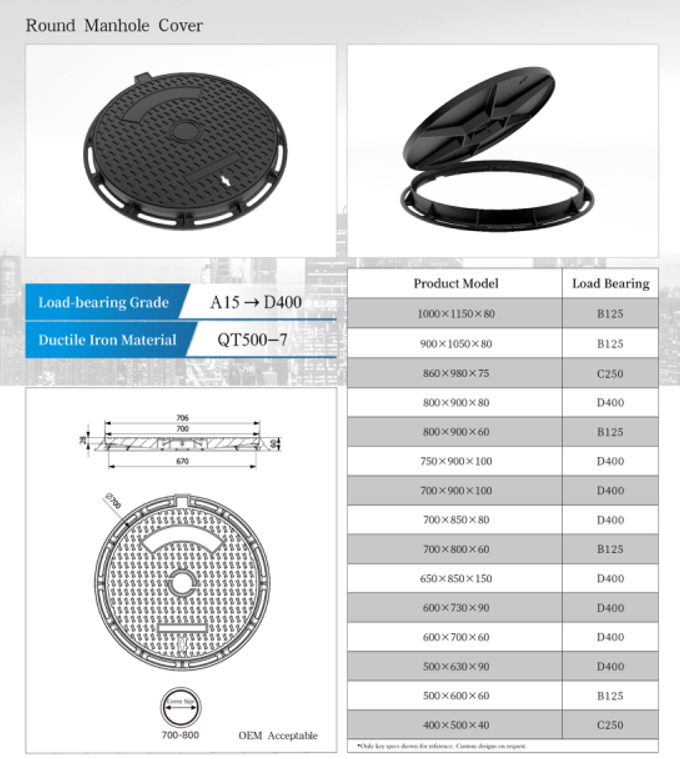 | Size (Diameter) | Standard Load (EN124) | Frame Compatibility | Weight (Approx.) |