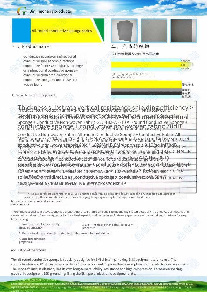 2.Introduction Conductive sponge is a product used for EMI shielding and ESD grounding. It is composed of two X-Y-Z three-way conductive sponge sheets on both sides to form a conductive adhesive pad. In addition, a layer of release paper is covered on both sides of the back for easy processing and forming. It has the following properties: 1. Low contact resistance and high shielding effectiveness 2. Excellent elasticity and elastic recovery performance 3. Extremely excellent reliability determined through product life aging test 4. Excellent adhesion performance |