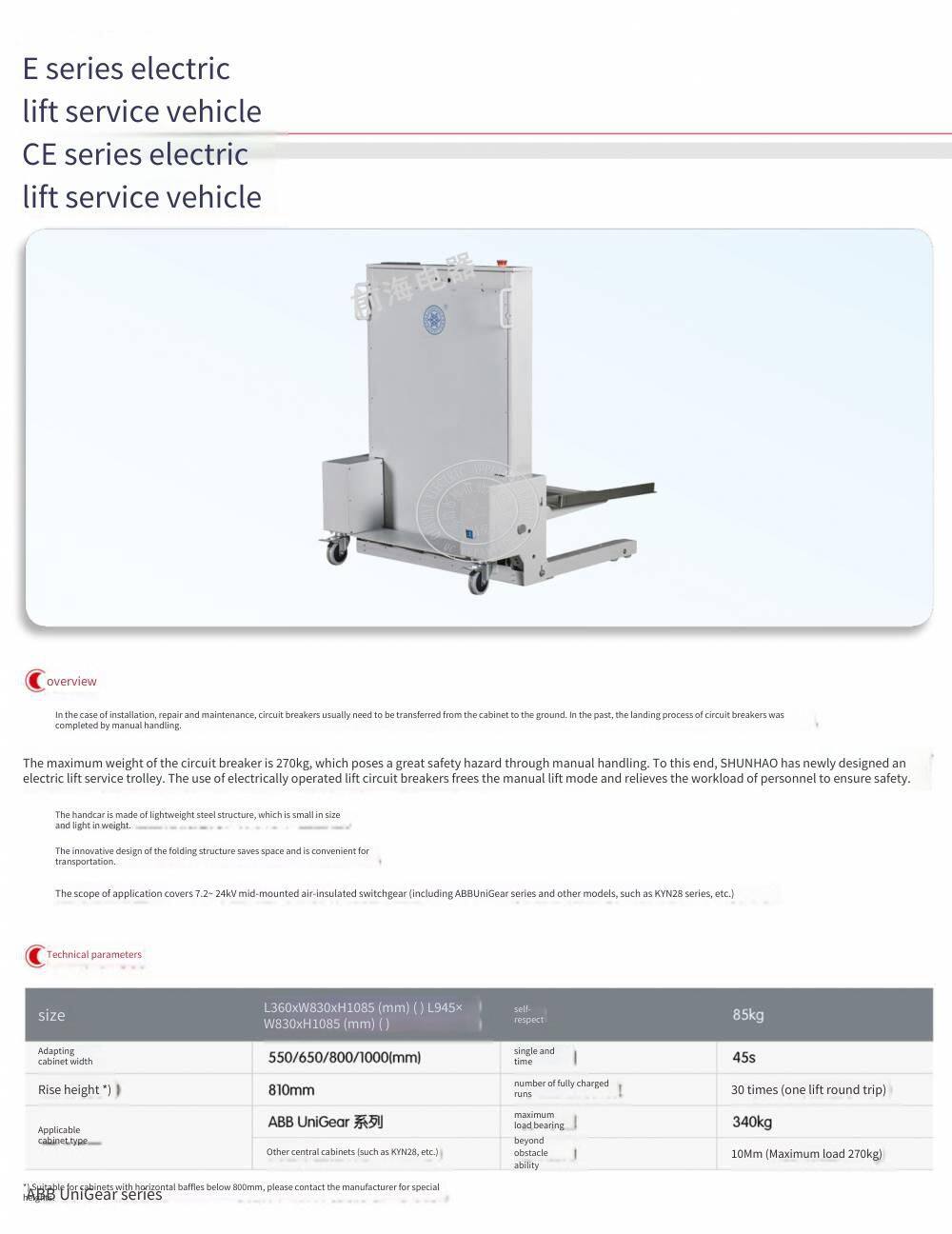 Electric transfer trolley for circuit breakers, electric lifting for switchgear transfer vehicles. The "electric lifting transfer vehicle" is also called the "electric transfer trolley". It is used for the installation, disassembly, and maintenance of vacuum circuit breakers in medium-voltage switchgear/switch cabinets. It is suitable for circuit breakers in switch cabinets of the 1000mm/800mm/650mm cabinet width series. Electric lifting saves time and effort and has high efficiency.