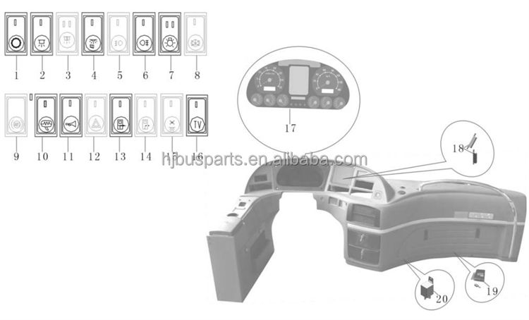 Peças elétricas de ônibus - Painel do painel de instrumentos - Chave rocker para ônibus Higer, Kinglong, Golden Dragon e ZhontongUS$ 2.5 - 2.5MOQ: 1 Piece