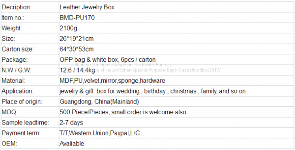 Этот ювелирный ящик с отличной расстановкой, привлекательным внешним видом, простой конструкцией и прекрасным исполнением. Он тонко спроектирован и изготовлен из искусственной кожи, высококачественной велюра и древесной плиты средней плотности. Он имеет разнообразные и удобные отделения, такие как мини-путевые сумки, зеркало, выдвижные ящики и другие, уникальный дизайн выдвижной панели.