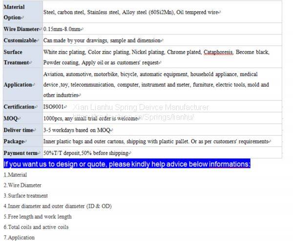 Мы являемся производителем пружин из Китая. Наши продукты включают: сжимающие пружины, растягивающие пружины, крутильные пружины, проволочные пружины, тарельчатые пружины и др. Можете ли вы предоставить чертежи требуемых пружин? Таким образом мы сможем вам предложить точную цену.чертежи требуемых пружин? Таким образом мы сможем вам предложить точную цену.
