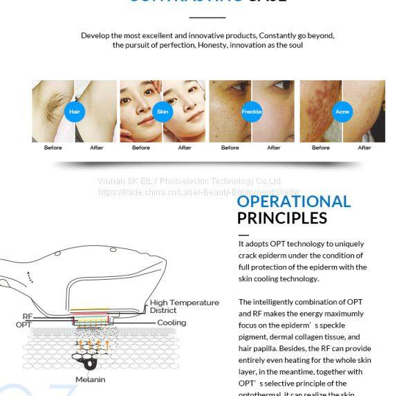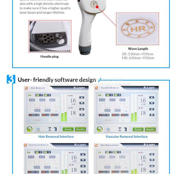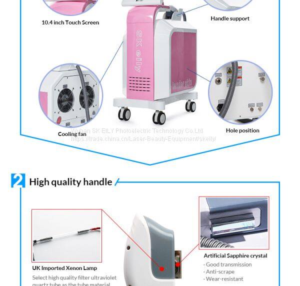 Вертикальная IPL-машина для бьюти, оборудование для ухода за волосами производителя. Лазерная световая терапия: рабочий рукоят 530нм - 950нм и HR: рабочий рукоят 640нм - 950нм. Два рукоят с разными длинами волн, выбирайте подходящий рукоят в соответствии с фактической процедурой лечения.