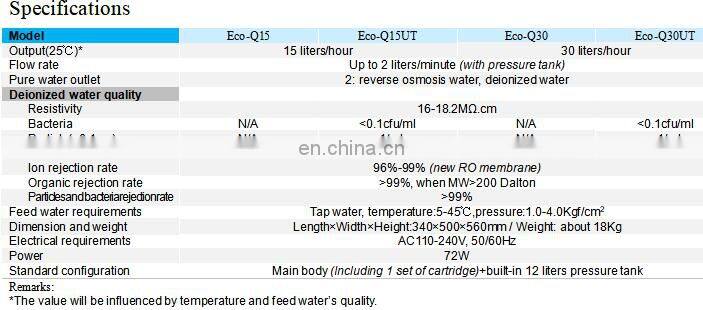 С входом для водопроводной воды ее производительность составляет от 15 до 30 литров в час. Она может производить одностадийную воду ОНП и сверхчистую воду. Коэффициент удержания ионов одностадийной воды ОНП более 96%, а удельное сопротивление сверхчистой воды абсолютно достигает 18,2 МОм·см. Она полностью соответствует самому высокому стандарту I ASTM, CAP, CLSI, EP и USP.