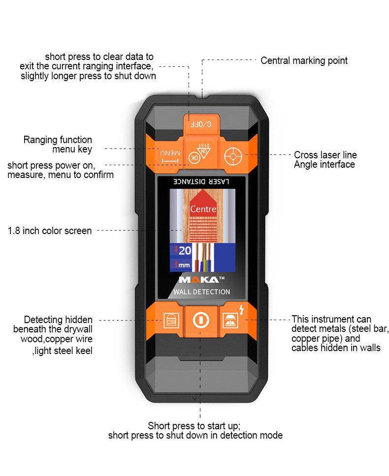 3.Первый многофункциональный измерительный инструмент для лазерного дальномера и обнаружения стен на рынке. Один заменяет два, полный набор функций, удобен в использовании и легко переносится.