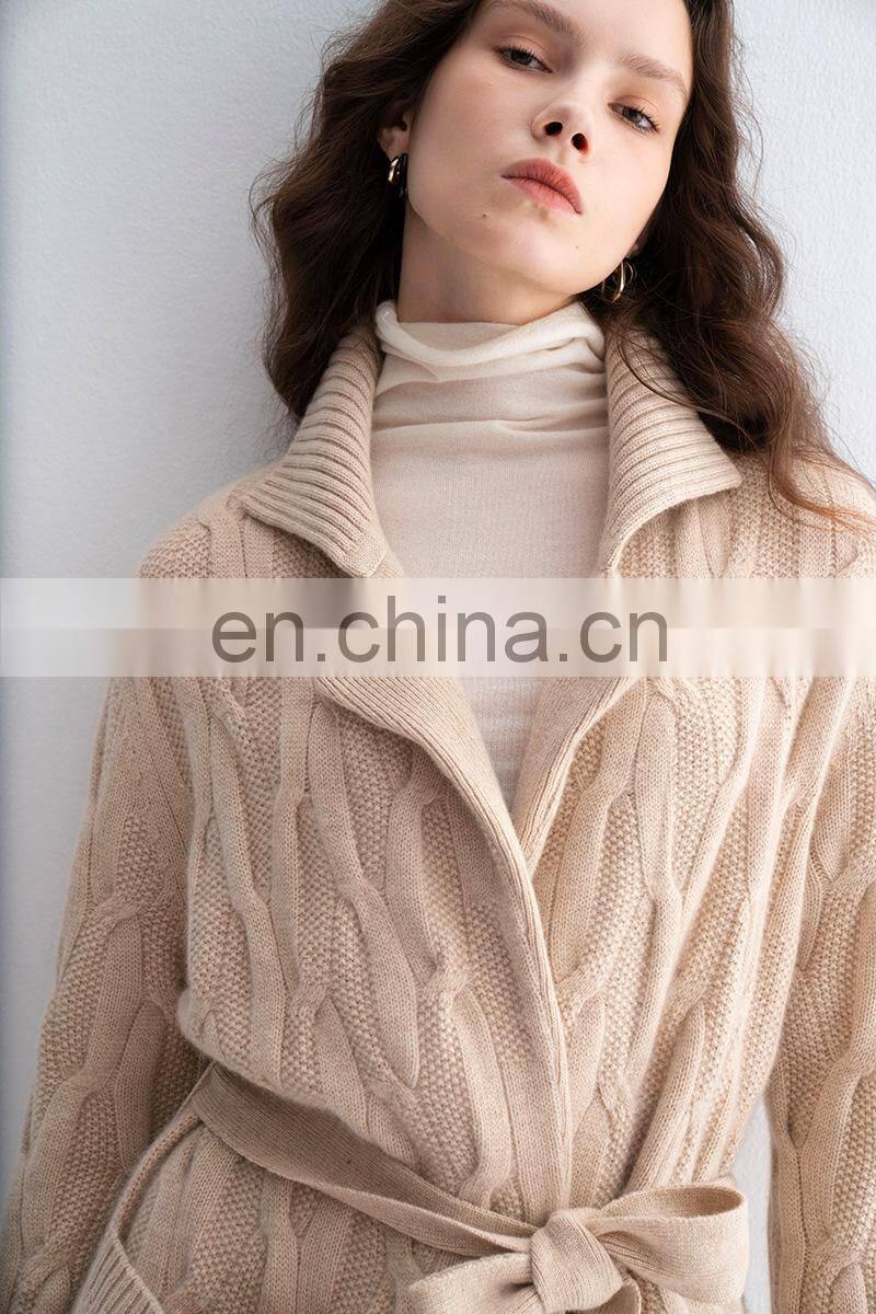 Женский длинный шерстяно-кашемирный кардиган с толстыми воротниками, выполненный в технике вязки на длинных спицах, с поясом