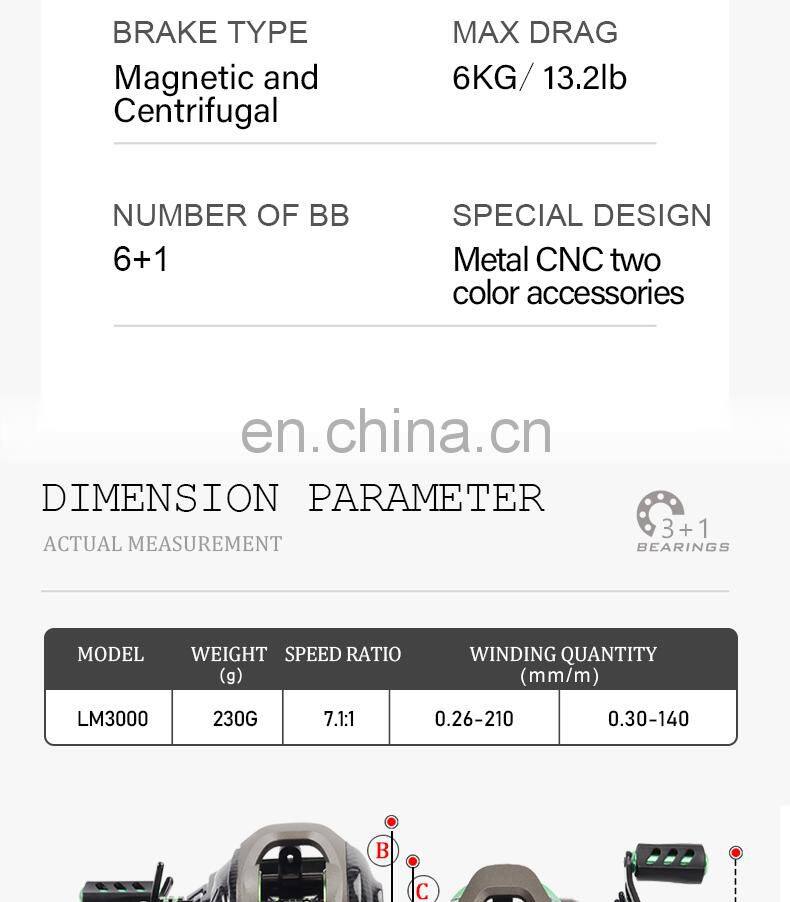 Новый дизайн 6+1BB 7.1:1 передаточное отношение, усилие торможения 6 кг, двойное торможение, металлические CNC-аксессуары двухцветного исполнения, спиннинговый катушка для бейткастинга