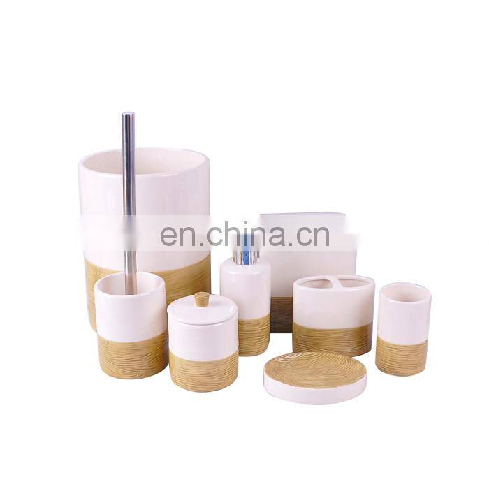 Восьмиштучный набор из керамики роскошных ванных принадлежностей белого и коричневого цвета для ванной комнаты с диспенсером для мыла