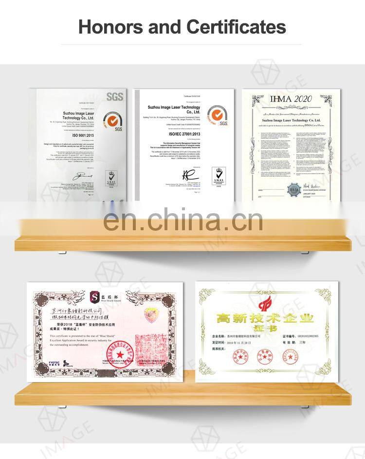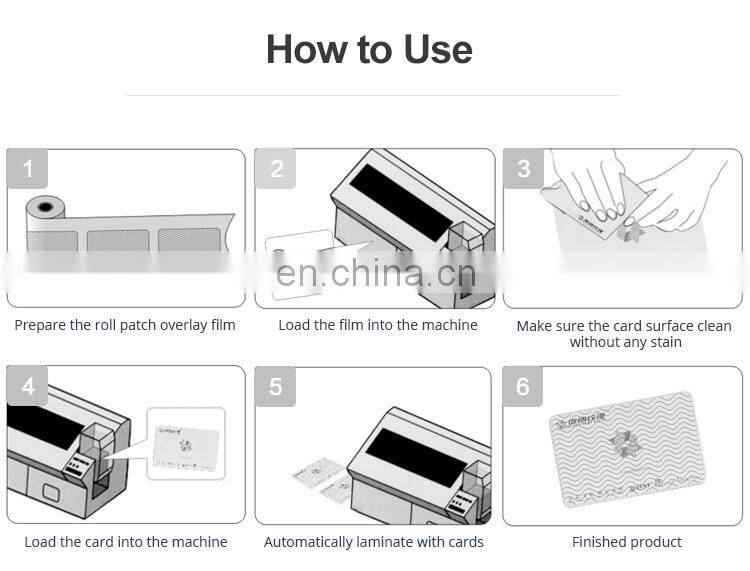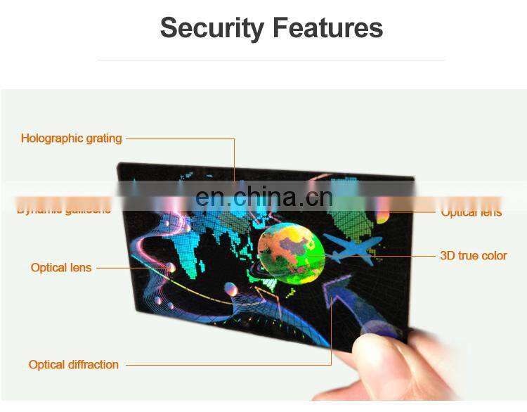 Голографический накладной слой специально разработан для стандартных по размеру PVC-учетных документов, таких как личные сертификаты, идентификационные карты для дорожно-транспортных событий и служебные карты для обеспечения безопасности. Пленка безопасности для PVC-карт предварительно вырублена по контуру и нанесена на разделительную пленку. Используйте голографический ламинатор для PVC-учетных карт, чтобы разместить и нагреть защитный голографический накладной слой на поверхности напечатанной PVC-карты.