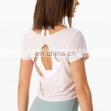 Оптовая женская короткорукавная футболка для занятий в зале, йоги, бега и фитнеса с вырезом на спине, быстрый просыхания и антибактериальными свойствами, кроп-топ