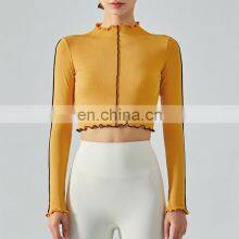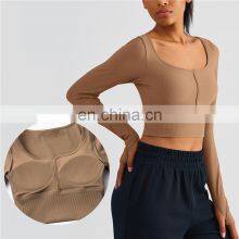 Оптовая спортивная одежда для бега и тренировок для женщин. Гимнастический кроп-топ с встроенной бюстгальтерной опорой, рифленый футболка для фитнеса, стретч с длинными рукавами