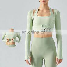 Оптовая индивидуально изготовленная бланковая двухвходящая в единицу йогатопка для женщин с длинными рукавами, в виде боди с подвязкой на шее, с рифленым узлом, спортивная одежда для женщин