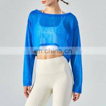 Самый новый летний топ с длинными рукавами для йоги из сетчатого материала с быстрым высыханием, свободный, дышащий, женский блузка для тренажерного зала и фитнеса, для активного отдыха и бега на улице